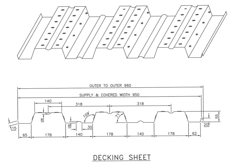 Decking Sheets are structural steel sheets used as a base for concrete slabs and roofing systems in modern construction. They act as a permanent formwork and provide excellent load-bearing capacity and structural support.